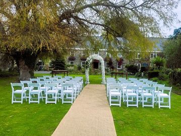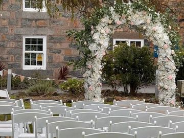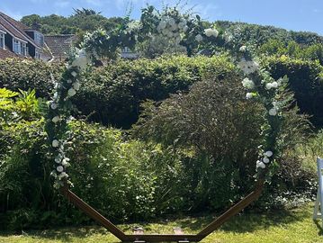 Our elegant 'arch' is a perfect backdrop for your wedding and photos. 2.15m (86 inches) tall and wide it will frame your ceremony and can be dressed with flowers, lights or drapes to suit your theme.