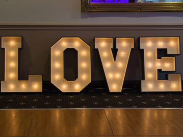Perfect for weddings, anniversaries and engagements, the letters can sit on the floor or on a table. Each letter is approximately 3ft high x 2ft wide (86cm x 63cm)